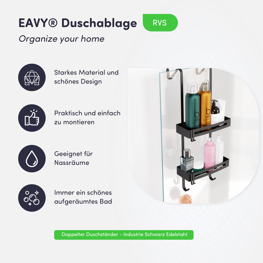 Verbessere dein Badezimmer mit der Duschablage von EAVY. Sie lässt sich einfach an der Duschtür befestigen und bietet mit zwei Saugnäpfen zusätzliche Stabilität. Hergestellt aus hochwertigen Materialien und gestaltet in modernem Mattschwarz, verleiht sie deinem Badezimmer ein elegantes Erscheinungsbild. Das geräumige, zweistöckige Design sorgt dafür, dass alle deine Duschprodukte stets in Reichweite sind.